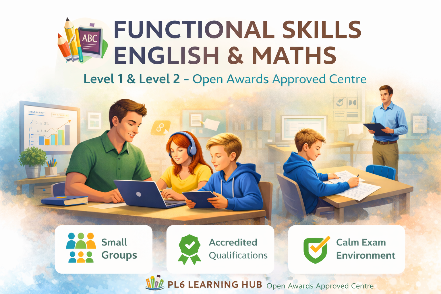 PL6 Learning Hub is proud to deliver accredited Functional Skills qualifications in English and Maths at Level 1 and Level 2. As an Open Awards Approved Centre, we provide structured tuition, exam registration, and a calm assessment environment — all within our small, supportive learning hub. Whether your child needs an alternative to GCSE, support after time out of school, or qualifications for college or employment, we provide a clear and supportive pathway forward.